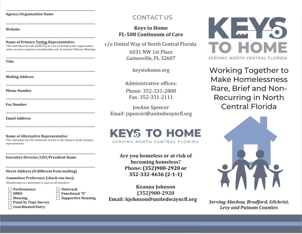 United Way of North Central Florida’s outreach specifically focuses on the counties: Alachua, Bradford, Dixie, Gilcrest, Levy, and Putnam County. Their organization Keys To Home is the Lead Agency for the FL-508 Continuum of Care. Keys To Home’s purpose is to provide aid to both local communities and individuals experiencing homelessness.