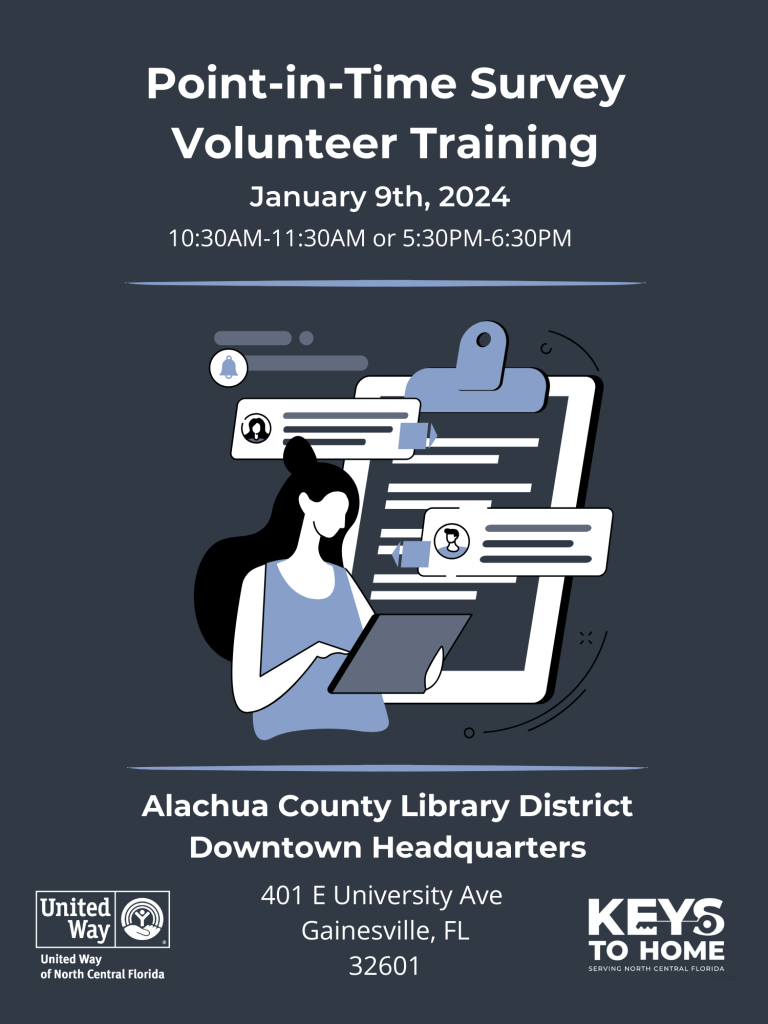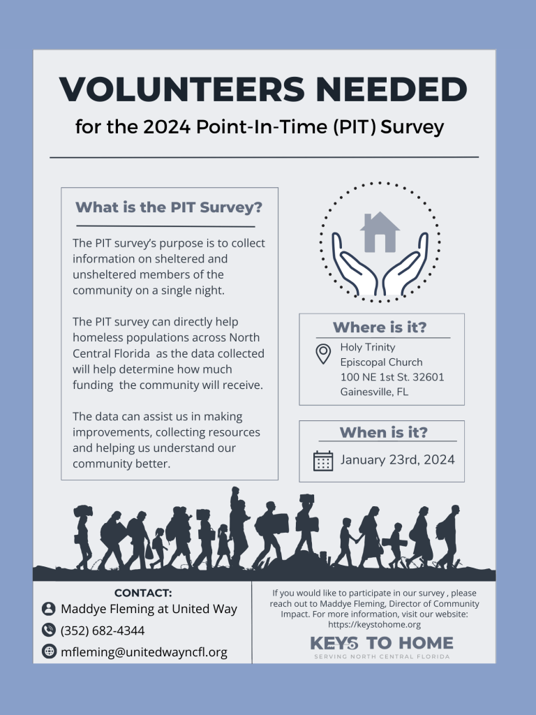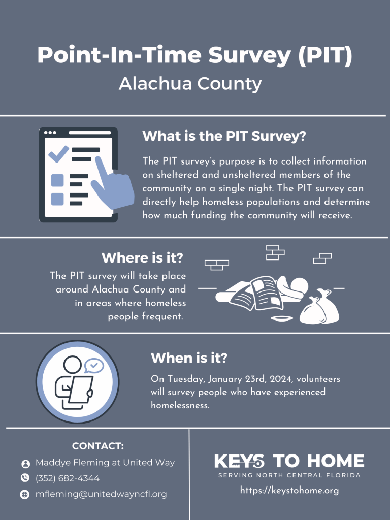 Every January, United Way of North Central Florida and Keys To Home coordinate a Point-in-Time (PIT) Count across North Central Florida. The purpose of the PIT Count is to collect information on members of the community who are currently experiencing homelessness. The press release below entails the purpose of the survey, when it will be taking place, and how volunteers can participate in trainings before the annual count.